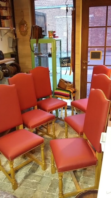 Herstofferen van 6 eiken stoelen met rood leder en zeer veel nagels!